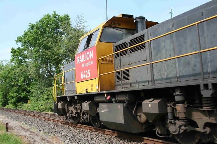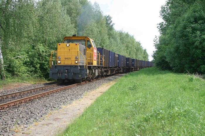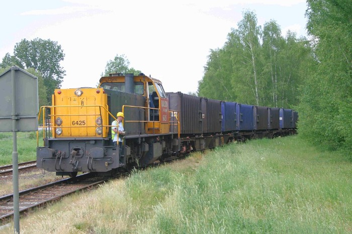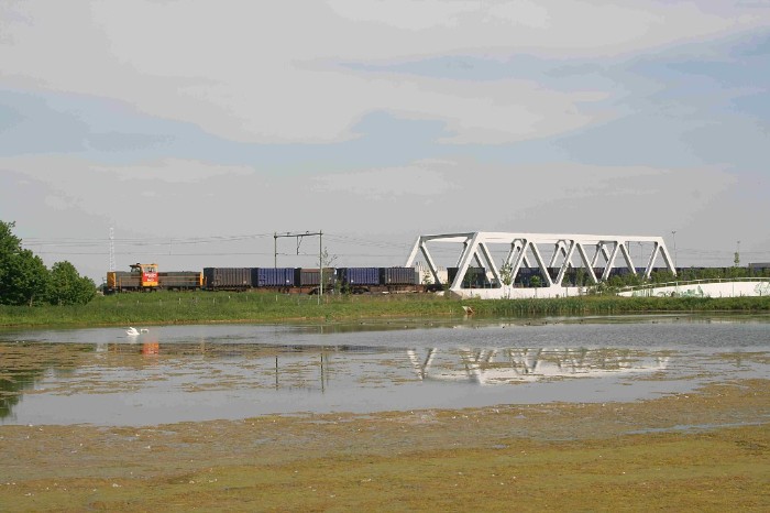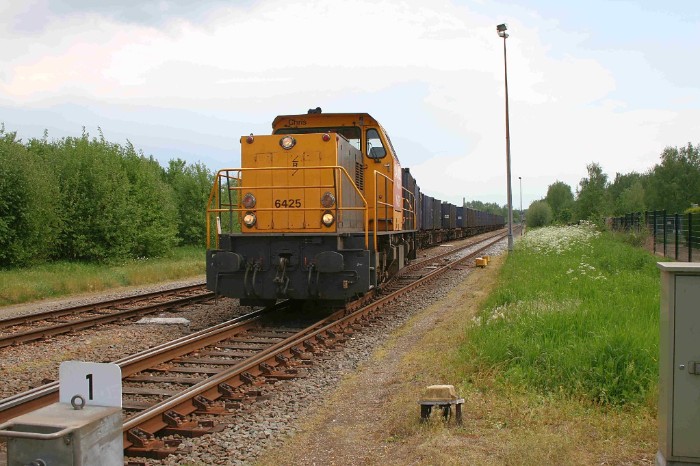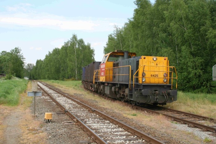 14/05/2008 In de regel wordt de afvaltrein uit Maastricht in Sittard gecombineerd met die uit Haanrade. Vandaag echter blijven de afvalwagens uit Maastricht achter op het Essent-terrein. Om 16:55 passeert even ten noorden van Sittard de 6425 met alleen de afvalwagens uit Haanrade een brug over een nog niet geopende autoweg. |