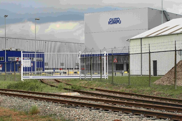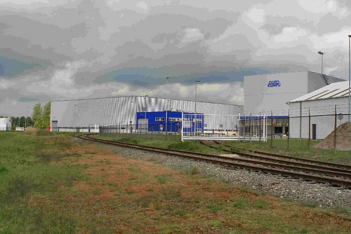 | Aan het eind van de stamlijn bevindt zich het staalverwerkend bedrijf Outo Kumpu dat met tussenpozen spoorwagens met staal de wereld in stuurt. Ondanks de magisch-realistische sfeer op de foto is goed te zien dat er twee spoorpoorten zijn. De voorste lijkt niet in gebruik. |