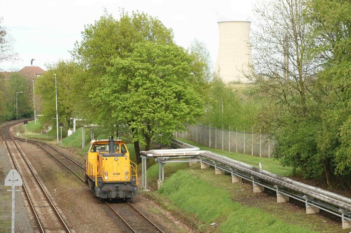 28/04/2008 Met op de achtergrond een koeltoren van DSM arriveert Railion 6480 om 18:20 bij de havensporen. Hij maakt direct vast aan de zes wagens met bulkcontainers die al uren staan te wachten. |