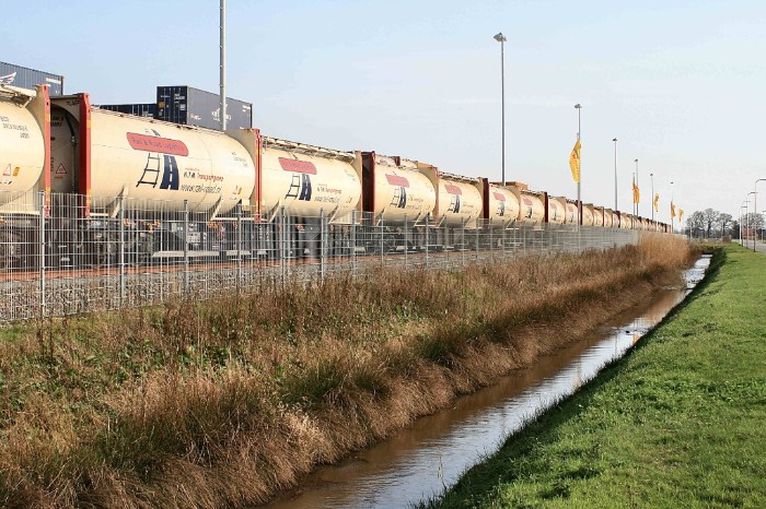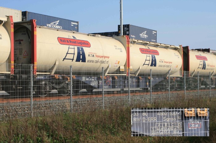 | Hij bestaat uit draagwagens type Sgnss met telkens twee bulkcontainers van Rail & Road Logistics. De containers komen via de BE uit Deuna en zijn bestemd voor een betonfabriek. Nog enkele jaren geleden werd het cement naar Laarwald aangevoerd in bollenwagens. |