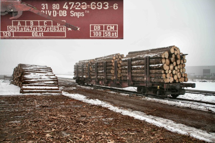 | 18/02/10 Op de losplaats van Coevorden Heege wordt regelmatig hout geladen. In de ochtend staat er al een wagen type Snps met boomstammentjes gereed. |