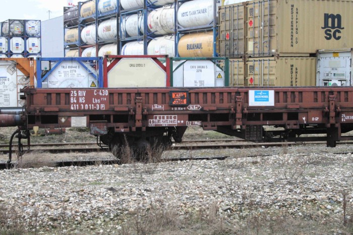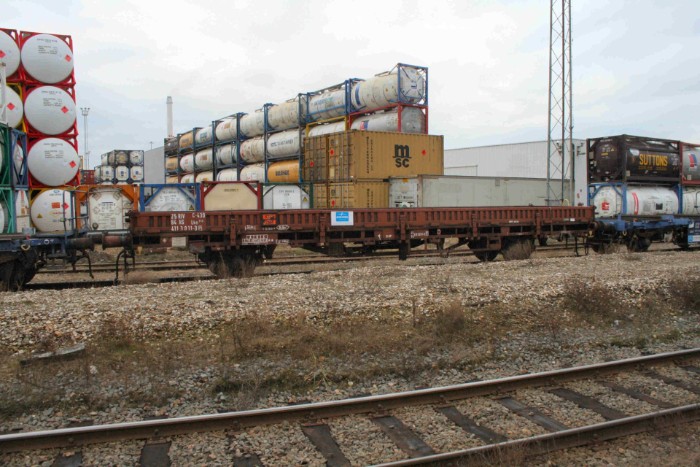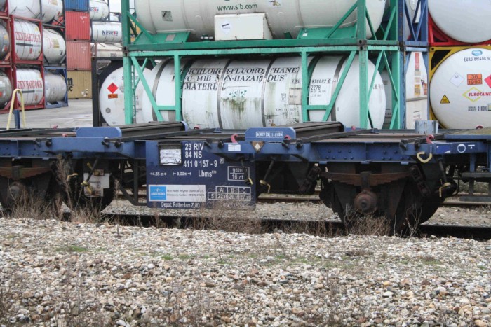 Platte wagens type Lbs van Akzo-Nobel, bestemd voor dezelfde stof (voor de liefhebber: pyrofore metaalorganische stof, vloeibaar, reactief met water) als de zojuist geplaatste tankcontainer. |