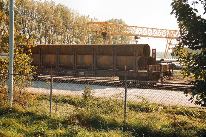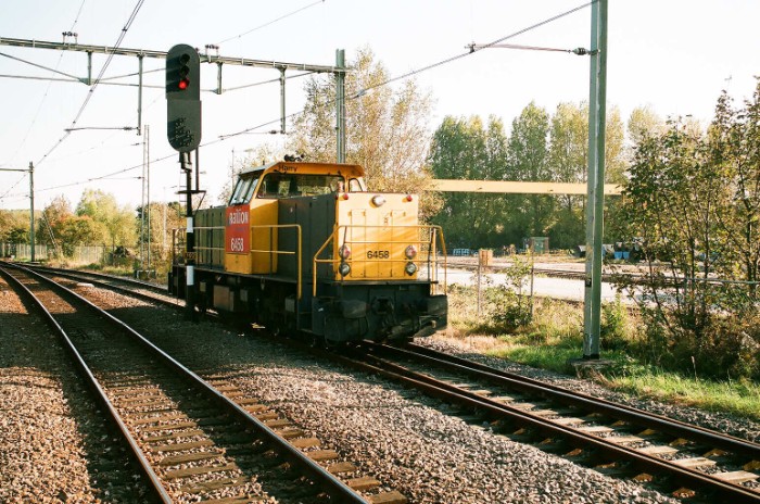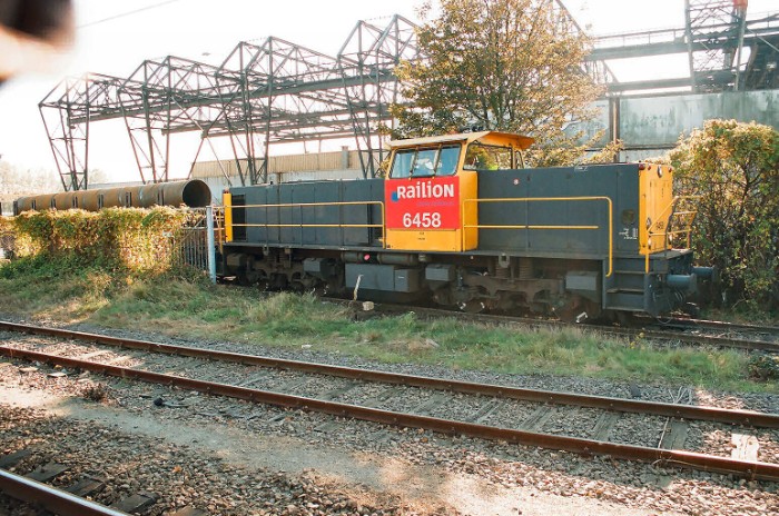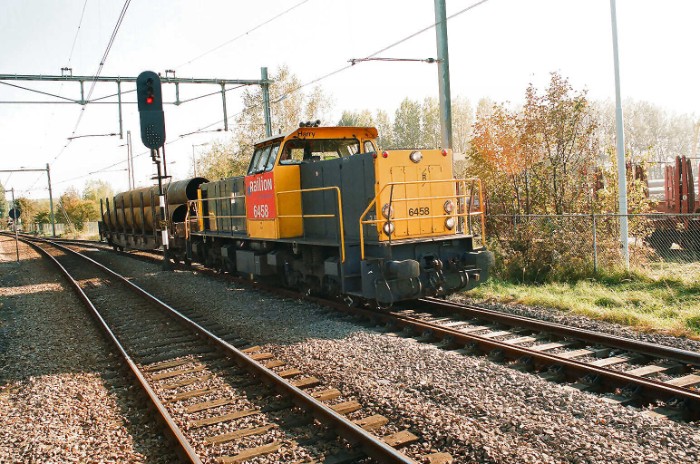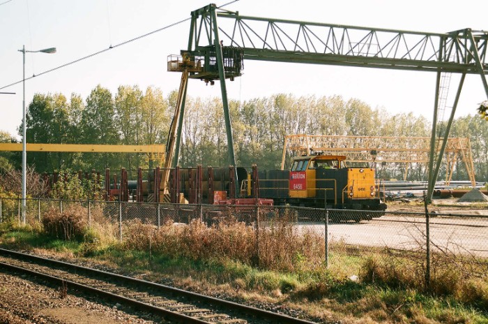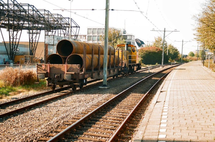 De aanvoertrein 55031 met loc 6458 brengt met ruim veertig minuten vertraging om 14:48 één met grote buizen beladen wagen op het buitenspoor, waarna de trein bij Conline naar binnen geduwd wordt. |