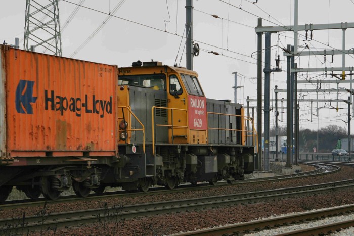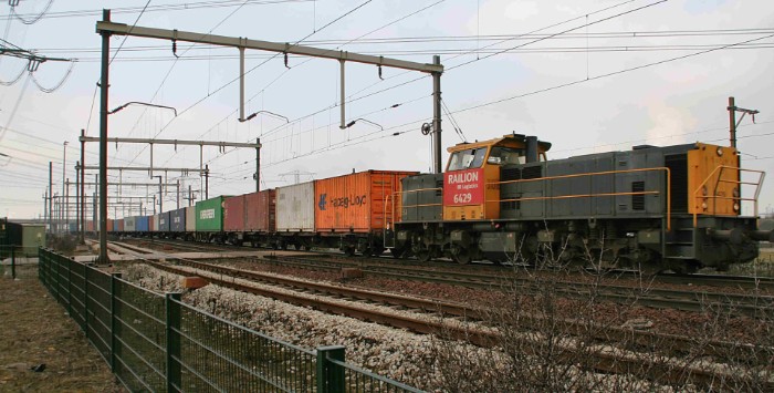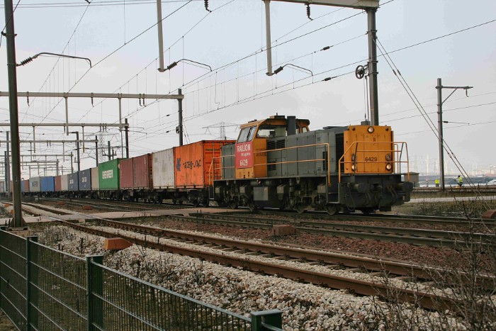 15/02/10 Om 13:28 verlaat een DBSRN-shuttle de Maasvlakte. Het bepalen van welke trein dit is heeft een hoog gokgehalte. Dat geldt voor alle shuttles die hierna volgen. Volgens de dienstregeling waarover ik beschik zou dit de 42611 naar Basel kunnen zijn. Loc 6429 trekt het geheel naar de Waalhaven, waar hij verder beladen zal worden. |