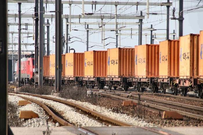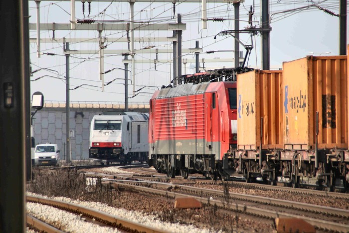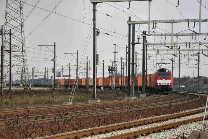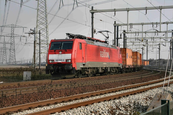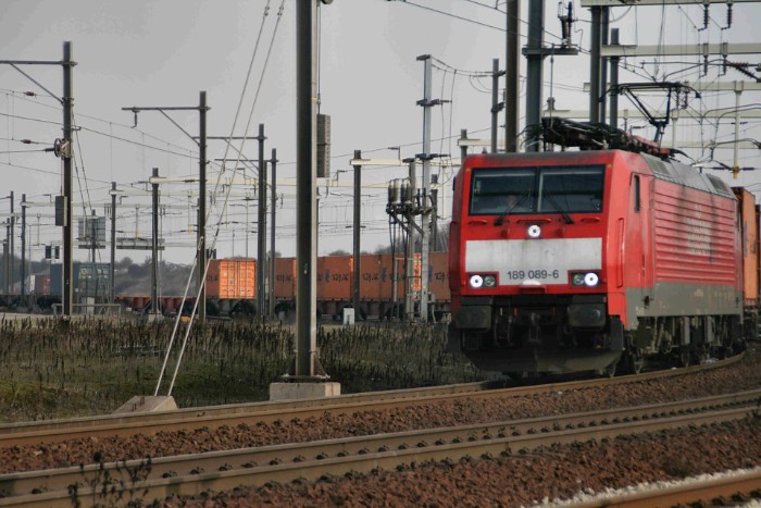15/02/10 Het is 13:47 als DBSRN 189 089-6 voorrijdt. Waarschijnlijk 42752 uit Duisburg. Het is te hopen dat hij tijdens een tussenstop in de Waalhaven al deels gelost is, anders is het een weinig rendabele rit geweest. Wat voor de Maasvlakte resteert, is een twaalftal vrolijk oranje gekleurde Hapag-containers. |