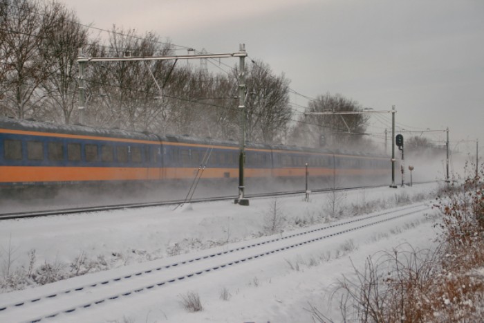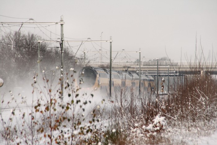 De intercity van NS naar Venlo hult zich in een zelf veroorzaakte sneeuwstorm. |