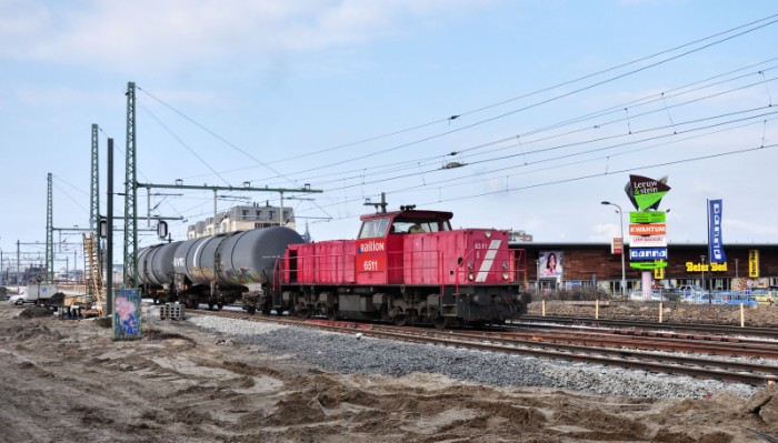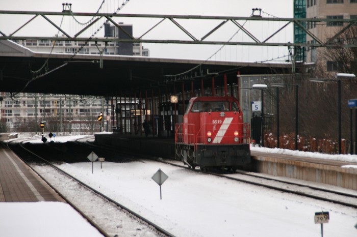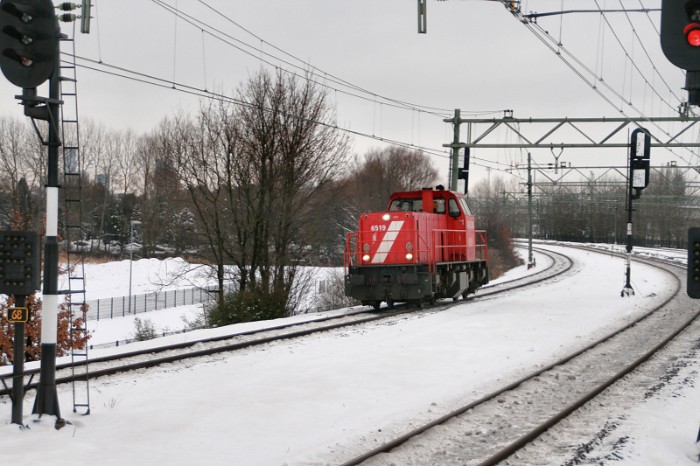 | 23/12/2010 Tweemaal per week wordt Gist-DSM in Delft bediend. Vandaag komt DBS 6519 als losse loc uit Kijfhoek om enkele lege wagens bij de Gistfabriek op te halen (geen foto). Doorkomst in Schiedam. |