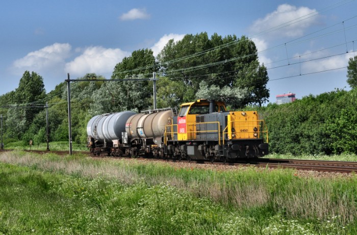18/05/2009 DBS 6450 met afvoertrein van DSM-Gist in de polder tussen Delft en Schiedam. Foto: Frank Schouten |
