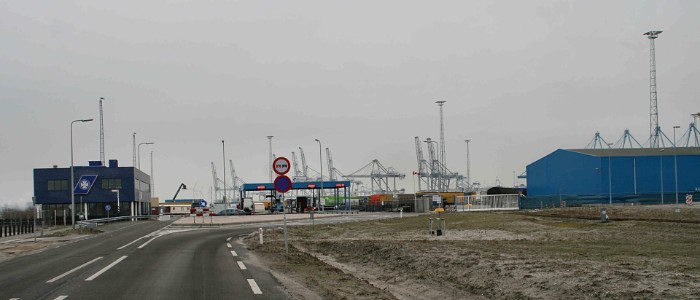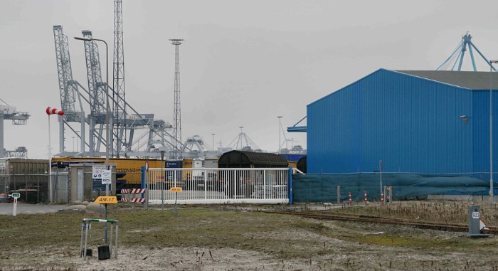 15/02/10 De ingang van het in 2006 geopende DFDS, Rechts de spoorpoort met nog net zichtbaar enkele schuifwandwagens. |