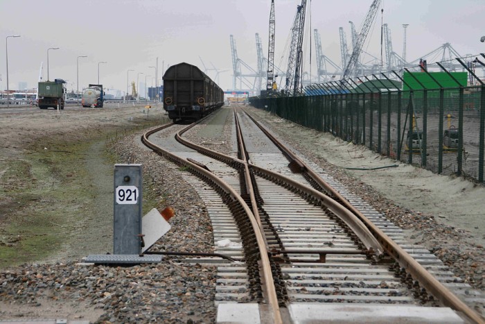 Op het omloopspoor voor de poort staat ook een rijtje van 9 schuifwandwagens. |