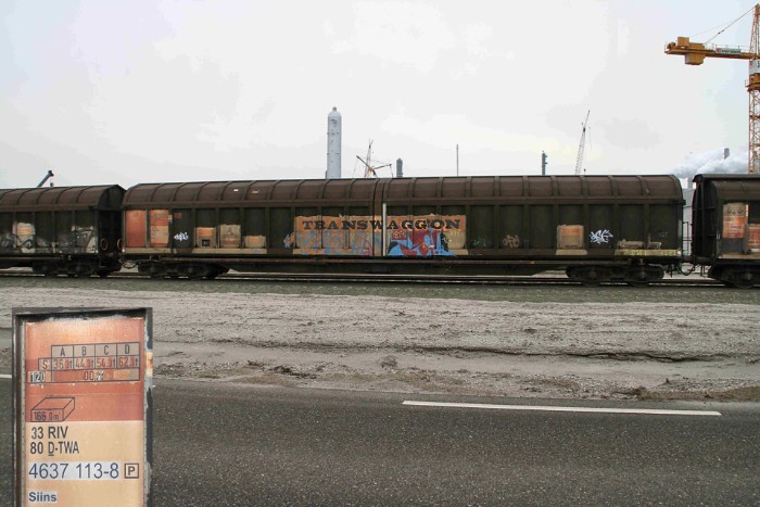 Het zijn Duitse Transwaggon- wagens type Siins. Werd er de eerste jaren vooral papier vervoerd, vandaag de dag zou het vooral om coils gaan. Het lukt vandaag helaas niet om vóór de vroeg invallende duisternis de afvoer van deze wagens vast te leggen. |