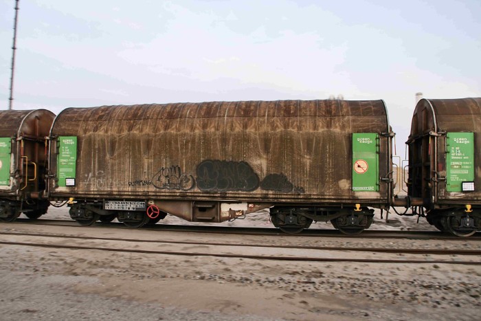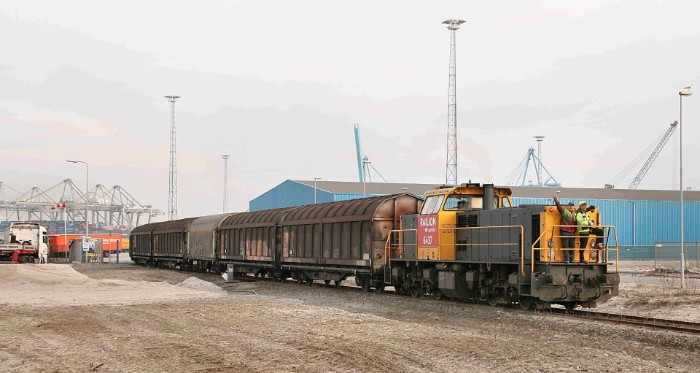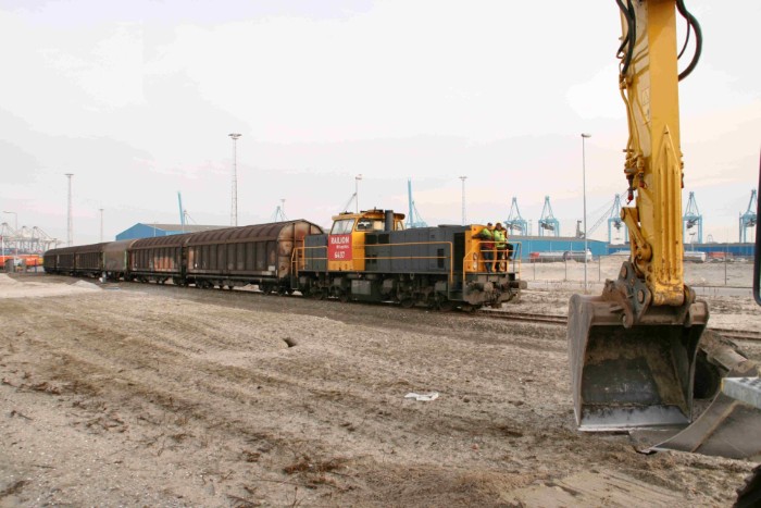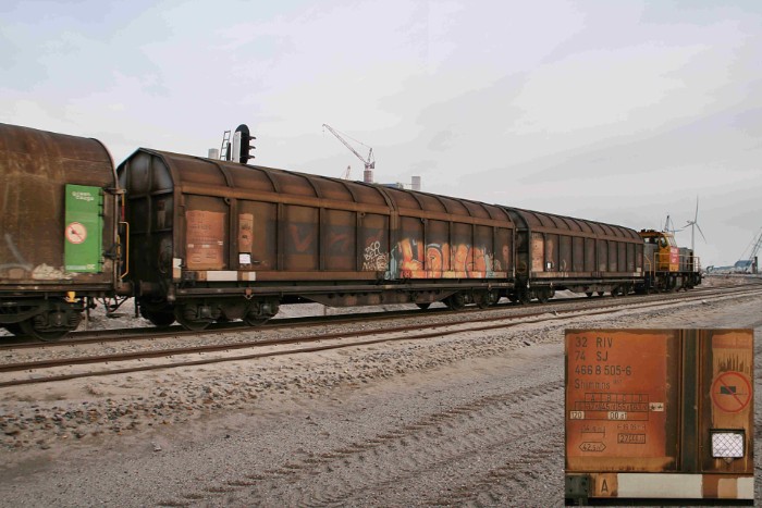De loc heeft om 18:06 behoorlijk moeite de fikse trein door de bocht te trekken. Hij bestaat uit 8 schuifwandwagens type Shimmns, 4 huifwagens Shimmnss (alle uit Zweden) en 4 ketelwagens type Zacns. Een alleszins volwaardige uc-trein! |