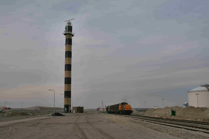 In het woestijnlandschap bij de vuurtoren bereikt de trein om 18:06 met de aangehaakte ketelwagens de aanluiting van de Antarcticaweglijn op de stamlijn. |