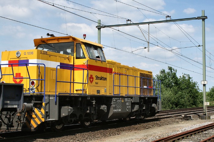De Opeltrein en een zandtrein van Strukton passeren Roosendaal Philips.