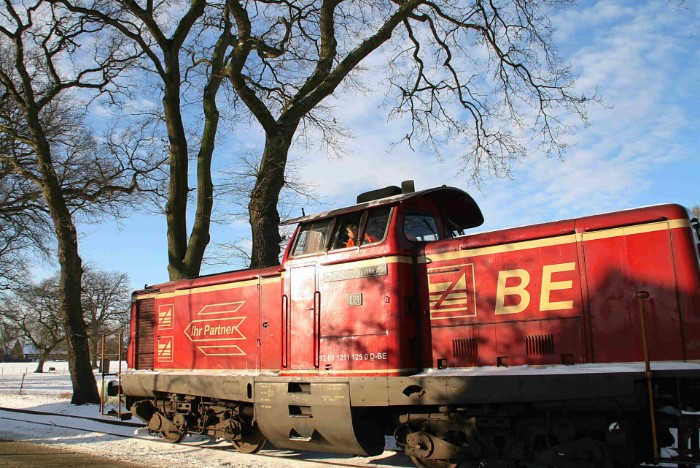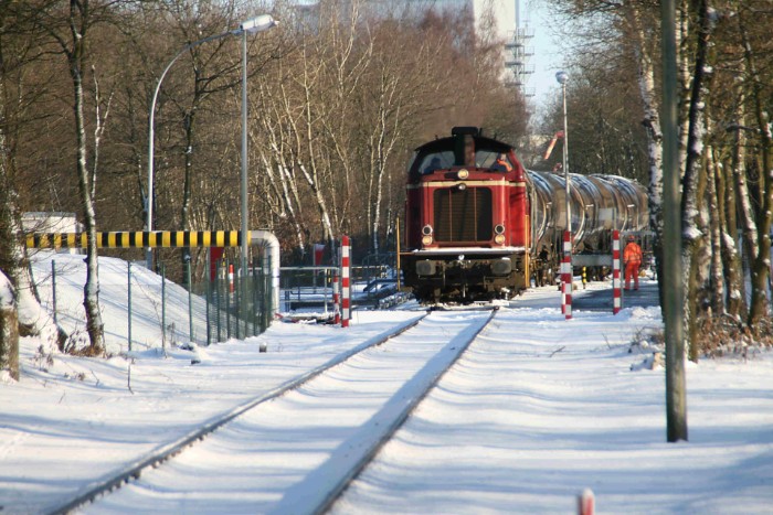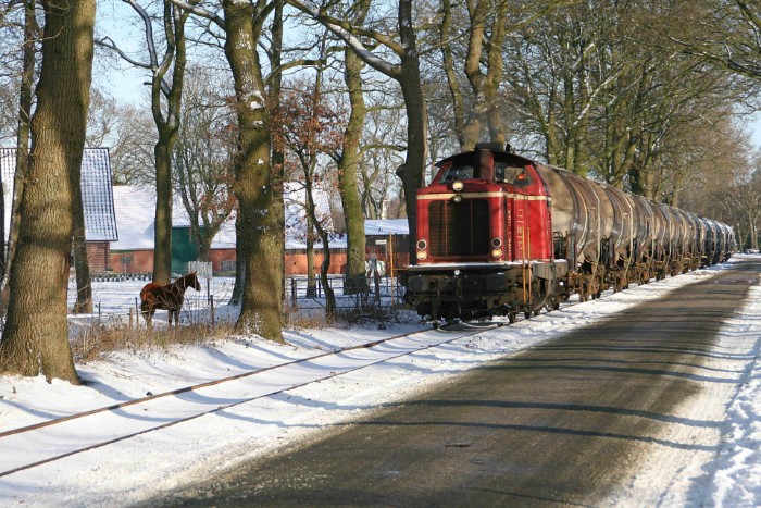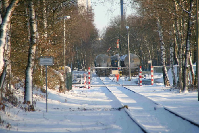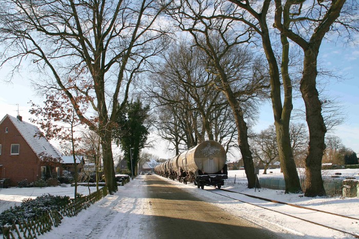| 21/12/09 Olielaadplaats aan de Hafenbahn van Emlichheim. Tweemaal zeven ketelwagens wachten in een winters landschap op transport. In Emlichheim is altijd wat te doen: zesmaal per week wordt de door ja-knikkers in de omgeving opgepompte olie afgevoerd |