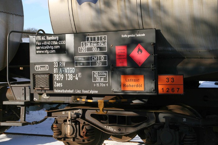 | De wagens zijn van het type Zaes van VTG (Roemeens fabricaat uit 2005) ; het vervoerde product staat duidelijk aangegeven: Roherdöl, ruwe aardolie. |
