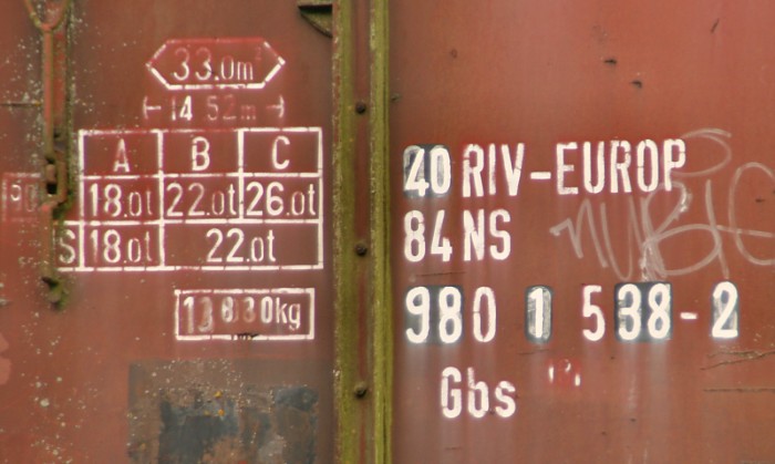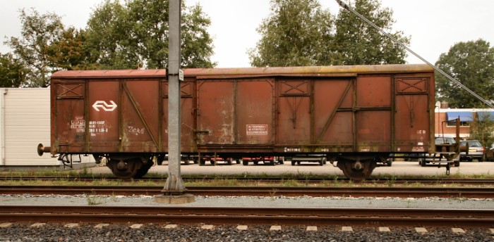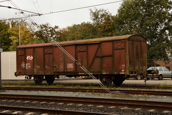 15/08/2011 Tot mijn verrassing herbergt Emmen nog een museumstuk. Aan de losweg ontdek ik een gesloten goederenwagen type Gbs. Hij staat er al even, getuige deze foto uit 2007: http://www.railtrash.net/images/Emmen-Buinen/slides/DSC_9297.html |