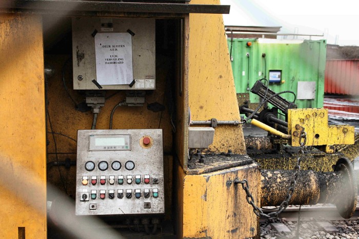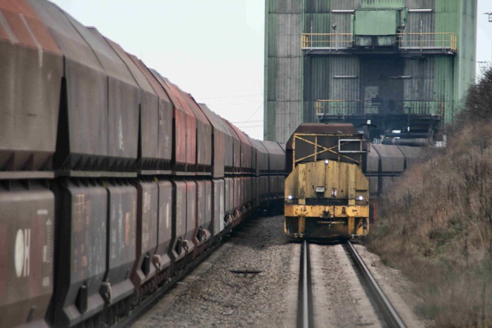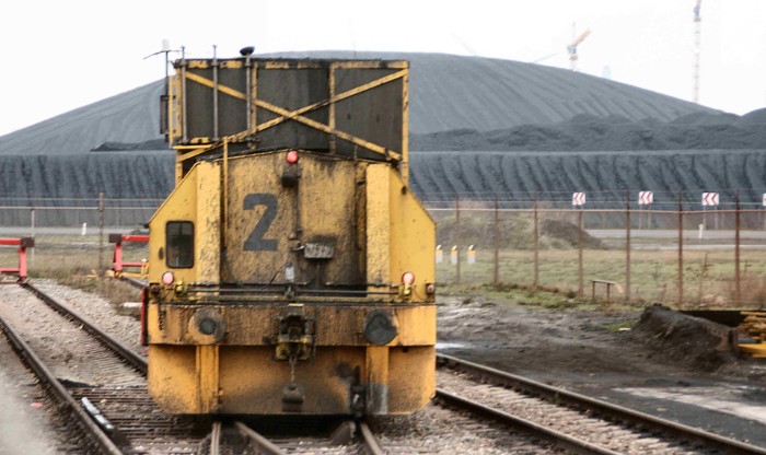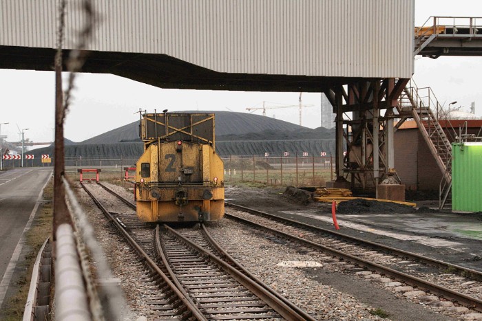 Aan het eind van de laadsporen staat de EMO 2 onder een transportband naar de haven te wachten op de volgende klus. Alle luiken zijn geopend, mogelijk is er een storing. |