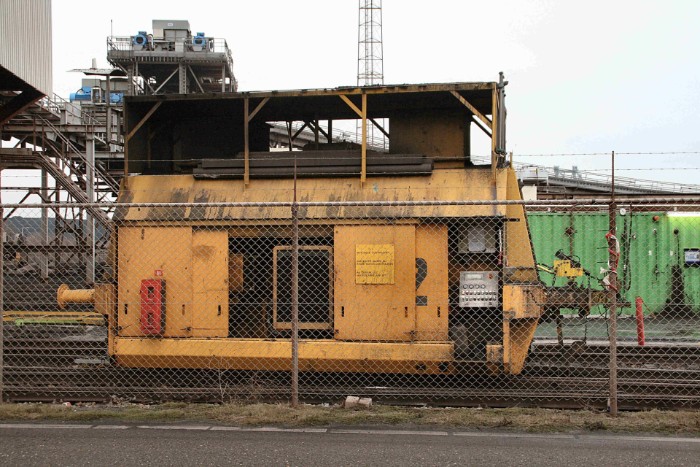 De EMO 2 is een lage machine zonder cabine uit 1977, met een vreemde zelfgebouwde imperiaal ter bescherming tegen verkeerd gestorte kolen. |