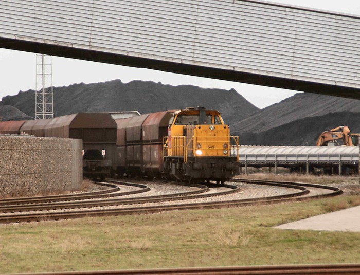 29/12/09 Loc 6451 van DBS staat na vertrek van de ertstrein om 15:40 al klaar voor vertrek. De lege trein links is kort tevoren aangevoerd, de loc is via het derde spoor omgelopen. Het is een efficiënt continu bedrijf. |