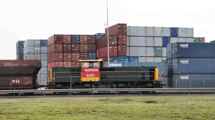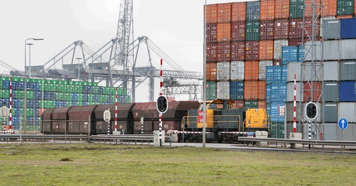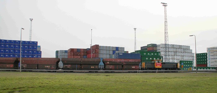Om 15:55 vertrekt de diesel tussen 7-hoog opgetaste lege containers (links ECT, rechts Kramer) in de richting van het emplacement. |