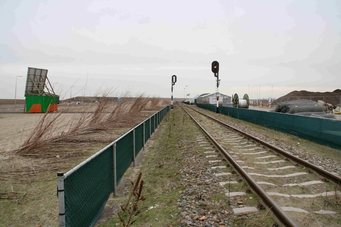 29/12/09 De spoorpoort van Euromax ligt onbereikbaar in het woestijnlanschap. De route er naartoe is al desolaat genoeg. De schermen zijn zichtbaar een geschike bescherming tegen zandverstuivingen, Verderop buigt de lijn naar rechts naar Euromax. |