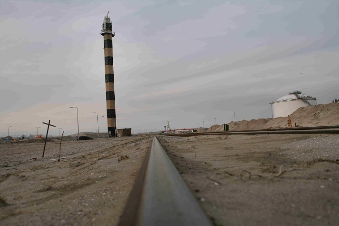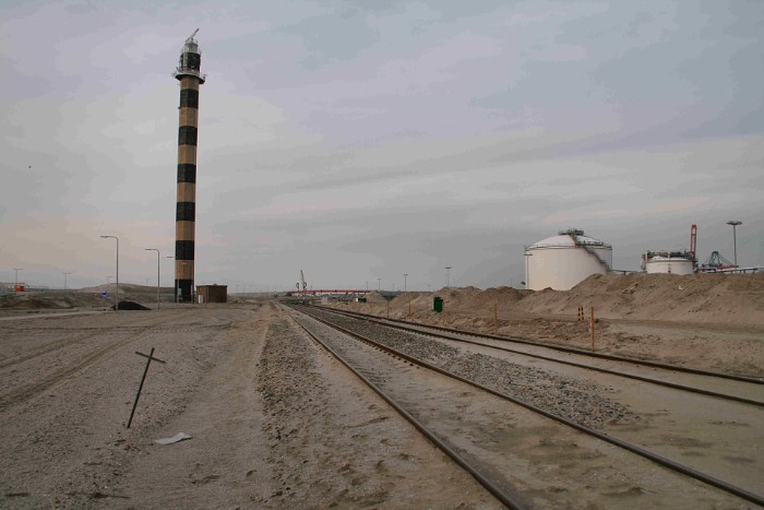 17/03/10 Het omloopspoor voorbij Lyondell passert de vuurtoren van de Maasvlakte. Het hectometerbordje heeft de geest gegegeven. |