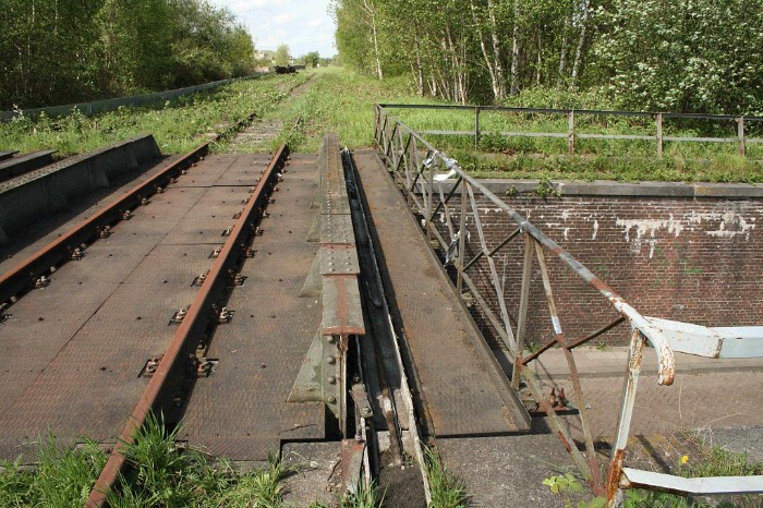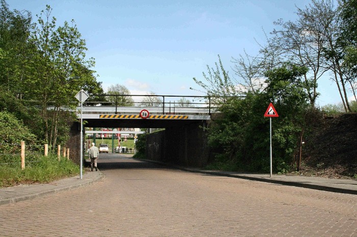 29/04/2008 Viaduct over de Fort Willemweg. Bovenop is goed te zien dat hier een emplacement gelegen heeft (met de toegang naar het emplacement Boschpoort). Ten behoeve van een bedreigde diersoort worden er stalen profielen langs de lijn geplaatst.