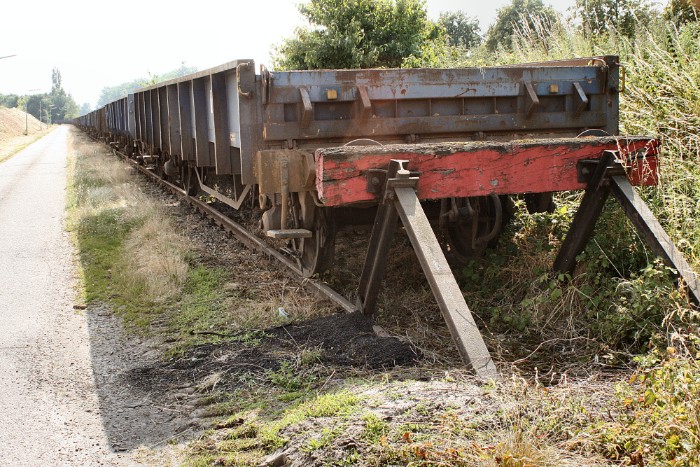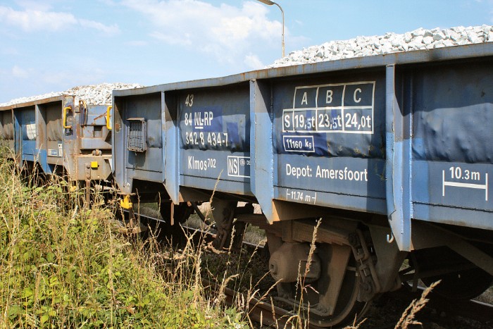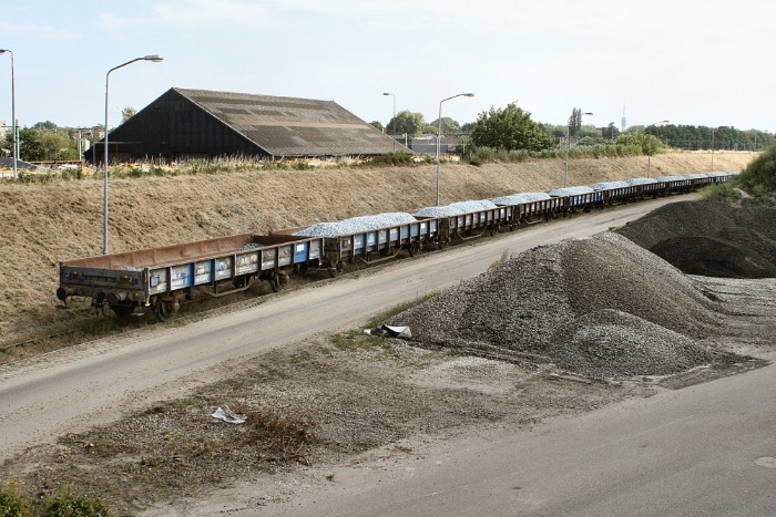 | De wagens staan niet alleen op het eigen spoor maar ook op het kopspoor waarvan (naar rechts onder) de aansluiting naar Stokvis aftakt; het zijn platte lage wagens van het type Klmos702. |