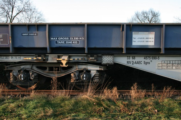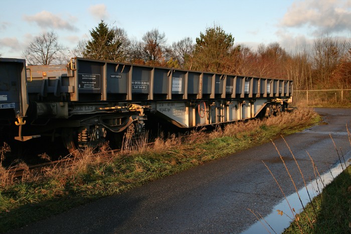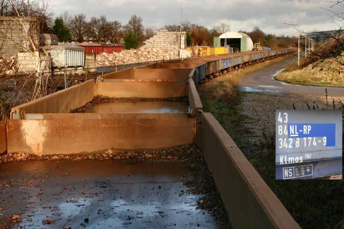| Helemaal aan het eind staat een bijzondere zandwagen: een uitzonderlijk lange bak op een vierassige containerdraagwagen type Sgns16. |
