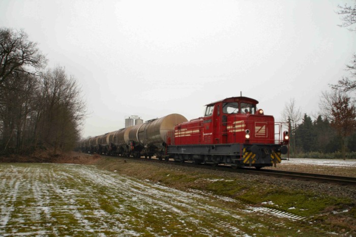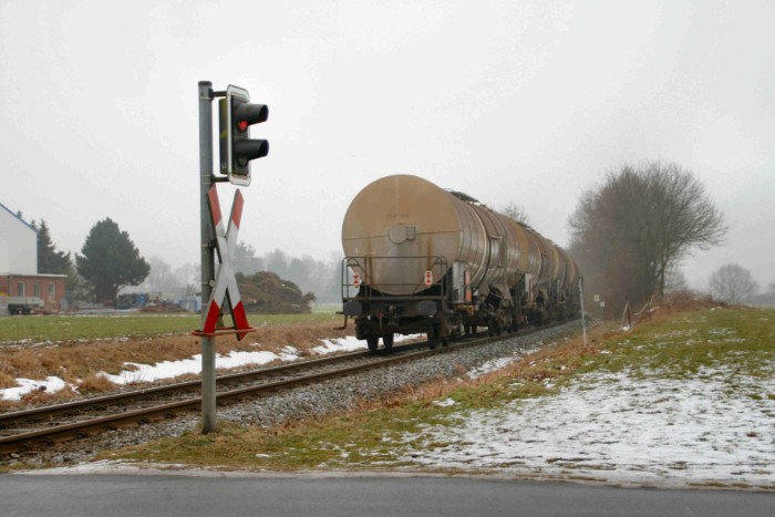 | 18/02/10 De mist is verdwenen,maar de dag blijft heiïg. Op volle snelheid rolt de olietrein al toeterend om 12:45 door het dorpje; het tracé is niet afgezet met hekken of zo, maar er zijn verder ook geen mensen te bekennen. |