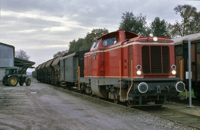 jaren ’90 Plaatsing van 5 x Tds beladen met kunstmest op de losweg voor de plaatselijke coöperatie in Hoogstede. Op de achtergrond een lange rij Gs'en voor belading met aardappels te Coevorden. Foto: Jan Dul |