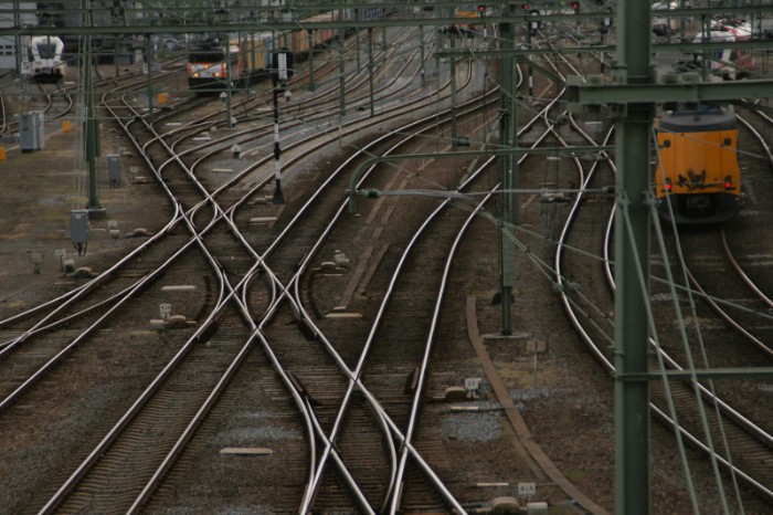 03/05/2011 De sporensituatie voor de containershuttle is ingewikkeld. De trein wordt vanaf de terminal links (niet in beeld) uitgehaald en via het meest linkse spoor (dat geen bovenleiding heeft) teruggezet naar een omloopspoor bij het station. Via de wisselstraat met een rijtje Engelse wissels bereikt deze vervolgens het spoor naar Zwolle rechtsonder. |