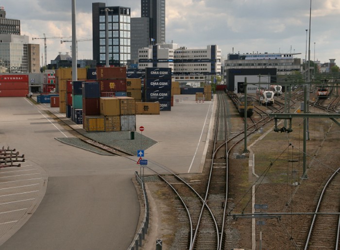 Over het linkerkopspoor wordt de containershuttle uitgehaald. Wat de bdoeling van de ingenieuze layout van de twee andere sporen is, is me niet duidelijk. |
