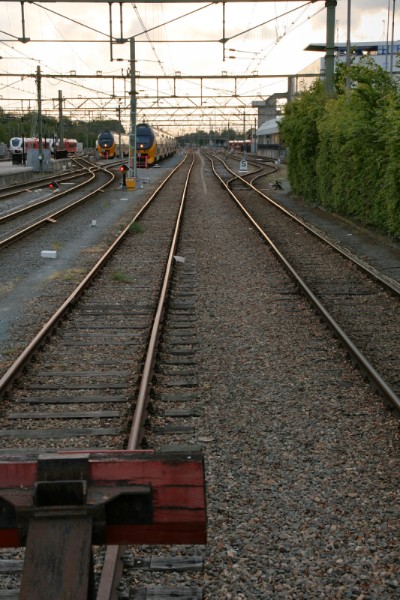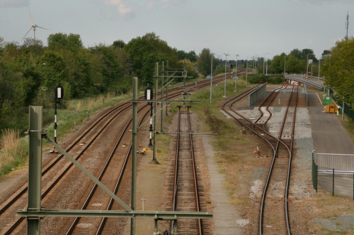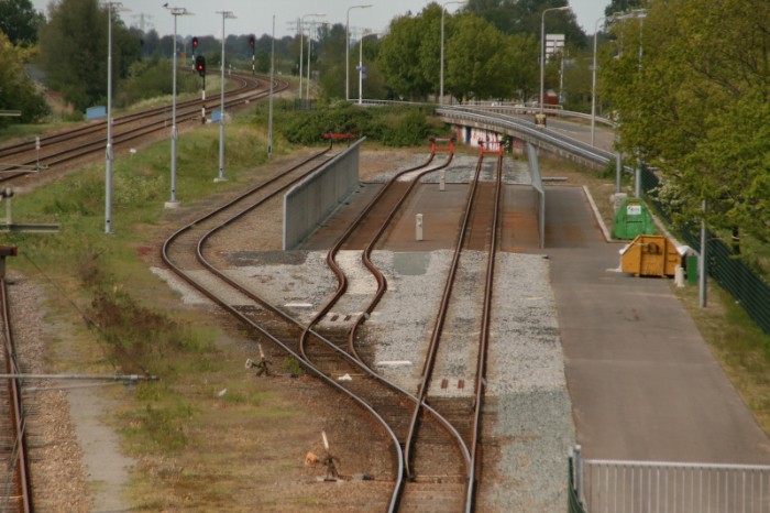 De foto's zijn gemaakt vanaf een brug over het emplacement. Dit is de westzijde van die brug: links de lijn naar Sneek, daarnaast die naar Harlingen. Het meest rechtse spoor boog in het verleden af naar Stiens. |