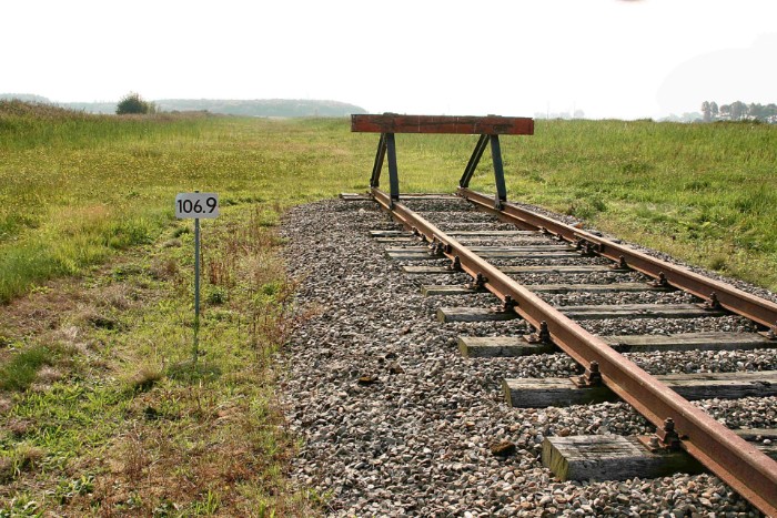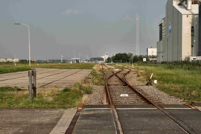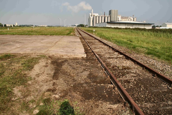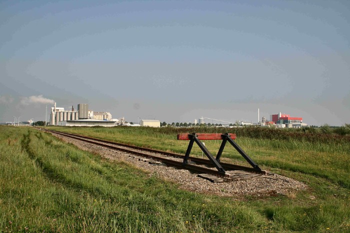 | 14/08/2010 Bij km 106.9 eindigt de stamlijn in volstrekt niemandsland. In de verte links PPG en rechts Rohm and Haas, daartussen de silo van MCN. |