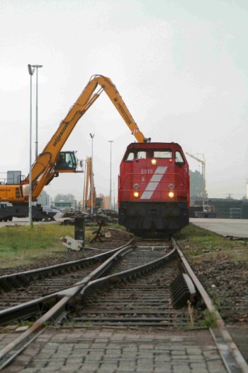 290409 7:15 Al in de vroege ochtend is er activiteit bij Van Merksteijn en dat zal tot de late namiddag zo blijven.  | Van Merksteijn is van de drie bedrijven op het Bedrijvenpark Twente bij Almelo die een spooraansluiting hebben de grootste gebruiker. Railion 6519 heeft vandaag een bijzondere trein afgeleverd: een proefvervoer uit het oosten van Duitsland. Vijf wagens worden op het voorste deel van het losspoor ontdaan van hun vracht: bundels staaldraad en op het achterste gedeelte direct beladen met vlechtmatten voor de betonbouw. Een uiterst effectief vervoer. Nu hopen maar dat de proef bevalt. |