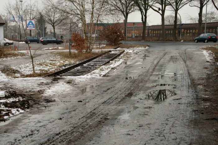 | 18/02/10 Aan de zuidzijde van het emplacement liggen nog net de restanten van het spoor naar alweer een voormalige textielfabriek, de Norgatex. |