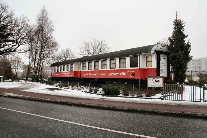 | En op een uithoek staat op een vergeten kopspoortje dit, een ontmoetingsplaats in oude reizigerswagons. |