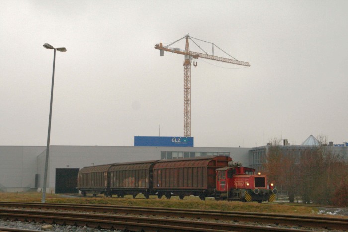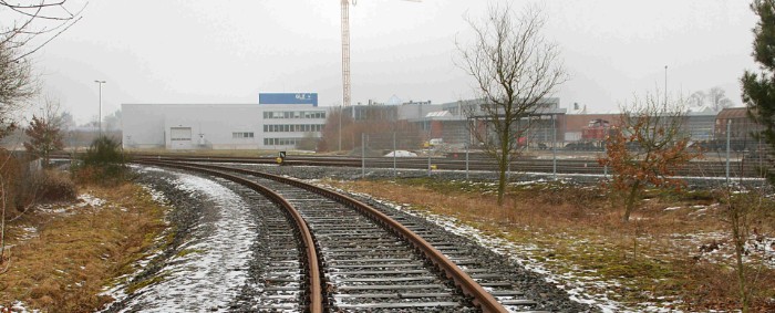 | 18/02/10 De nieuwe gebouwen van de Bentheimer Eisenbahn in Nordhorn Süd. Rechts de kantoorgebouwen en werkplaatsen, links het transportbedrijf GLZ. |
