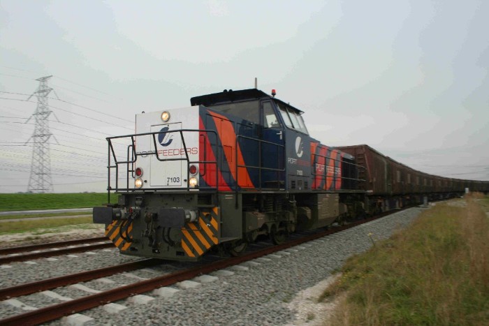 Het is 17:35 uur, wanneer de 7103 verlaat met 7 wagens met elk drie vuilcontainers het terrein van het afvalverwerkingsbedrijf OLAZ. |