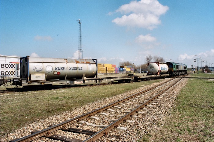 Een Hupac-tankcontainershuttle uit Ludwigshafen is ter hoogte van de Q8-raffinaderij op weg naar P&O. |