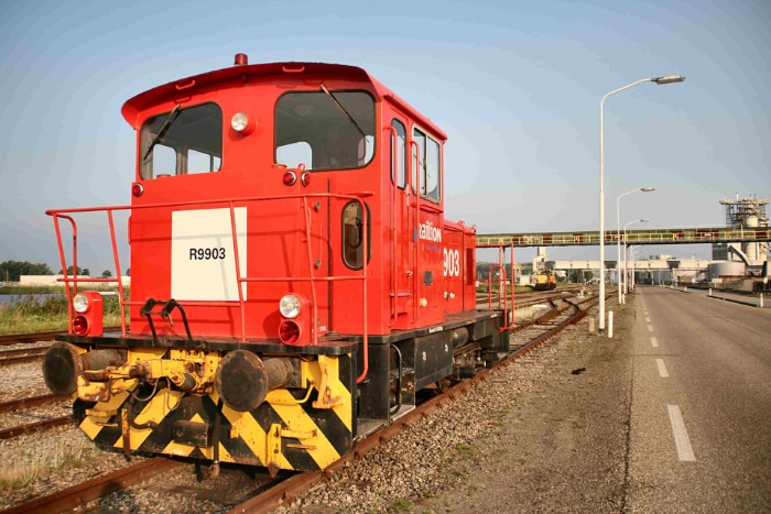 14/08/2010 De R9903 is een rangeerloc van DBSRN die door Railion in 2002 wordt overgenomen van Akzo. Het is de Gmeinder 5589 uit 1982. Rond 2005 verzorgt deze al het rangeerwerk in de haven; tegenwoordig wordt dat door de 6400 van de aanvoertrein gedaan. De R9903 staat al geruime tijd werkloos om het Akzo-emplacement. |