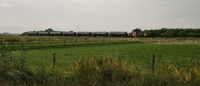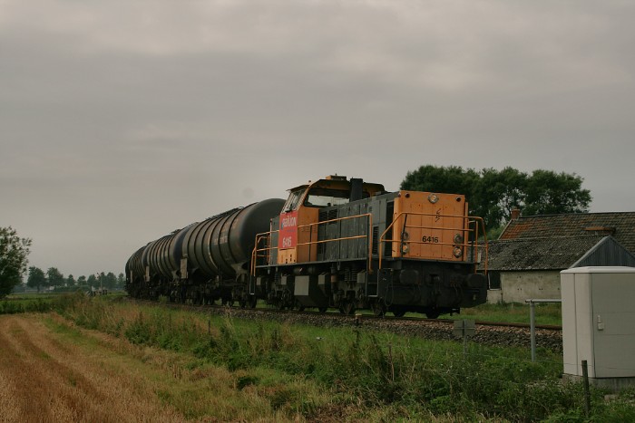 Even voor Roodeschool Aansluiting (de splitsing Eeemshaven/Roodeschool) komt DBSRN 6416 met flinke snelheid voorbij