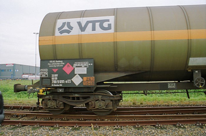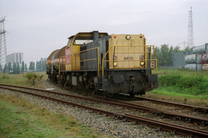 18/10/2006 12:30: Met twee wagens ethyleenoxide verlaat Railion 6470 de aansluiting van Shell.