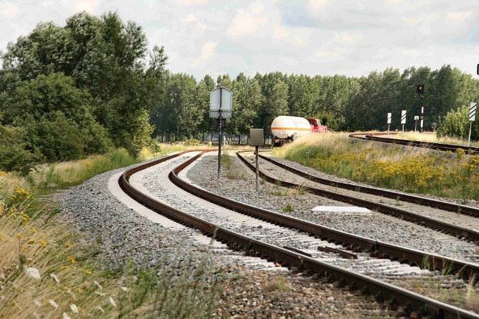 | 20/07/09 Hoog boven het maaiveld verheft zich de splitsing bij Sluiskil. Rechts loopt het spoor verder omhoog naar de brug richting Terneuzen, links gaat het naar Dow. De bovenbouw is recentelijk vernieuwd. Op het passeerspoor kruisen vandaag twee treinen. |