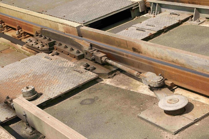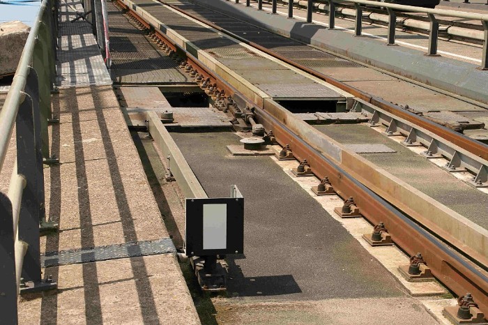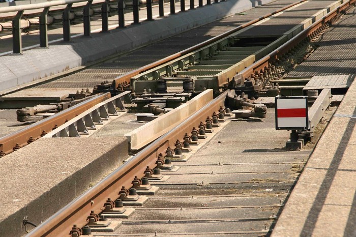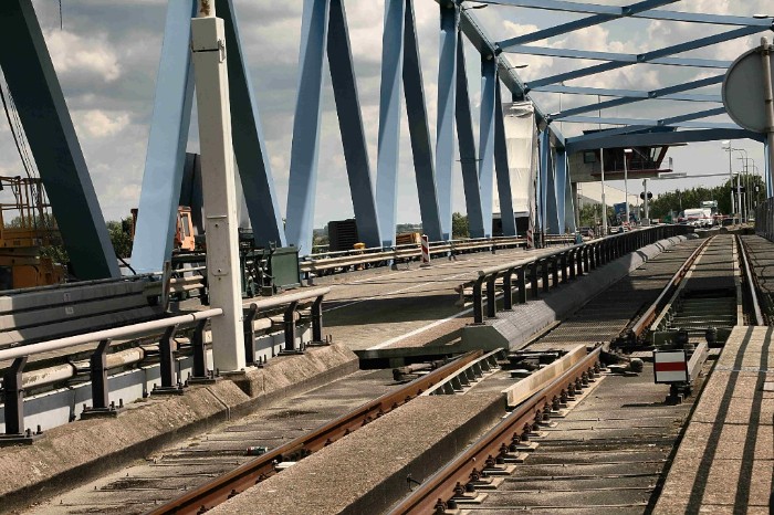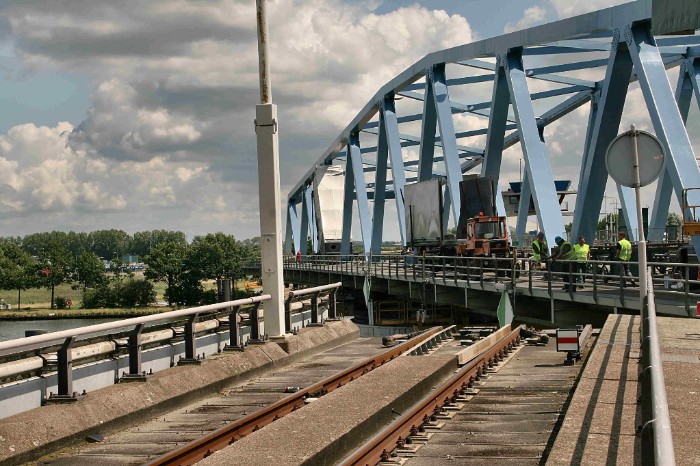 | 20/07/09 Bijna is de brug weer terug in zijn ruststand. Het minisein staat nog op onveilig, het wegdek moet nog een raildikte dalen. |