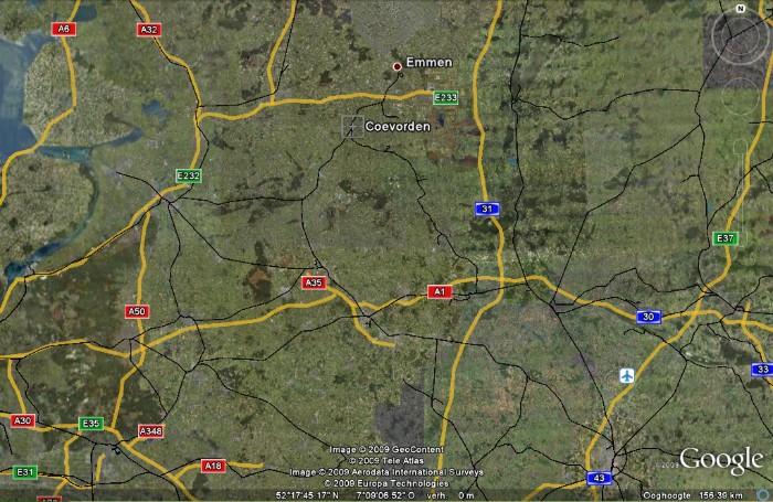 Bron: Google Earth | Sporen rond Coevorden; rechts van "A1" ligt Bentheim. |