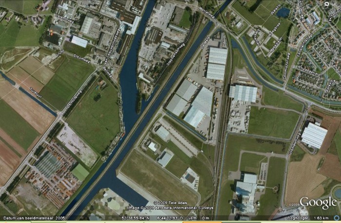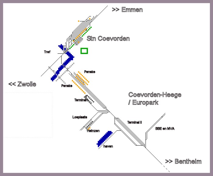 bron: Google Earth, december 2009 | Coevorden-Heege ontwikkelt zich sneller dan Google Earth; eind december 2009 geeft Google dit plaatje, dat wel een interessant beeld geeft van 2005. Geen Terminal II nog, en aan de huidige spoorweghaven ligt (weggemoffeld op de kaart) het legerdepot, de noordelijke sporen van Penske (overdekt) zijn nog in gebruik, de losplaats staat geheel vol met wagens. |