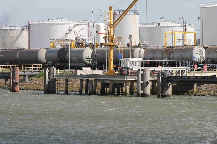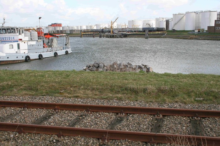 Vanaf de overzijde van de haven is het laadpunt van Standic te zien. Op de voorgrond het spoor naar de Krabbepolder. |